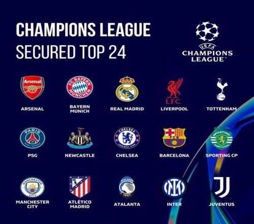 至少确保附加赛球队:皇马、利物浦、热刺、巴黎、纽卡、切尔西、巴萨、葡萄牙体育、曼城、马竞、亚特兰大、国米、尤文